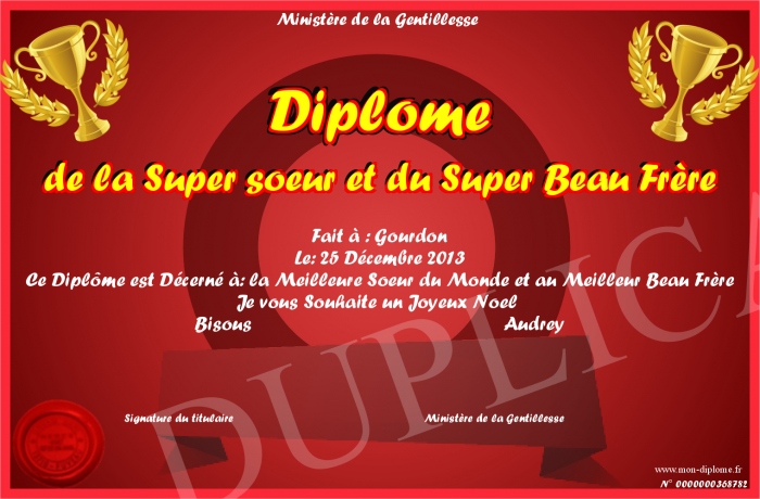 Envoyez par email votre Diplôme de la Super soeur et du Super Beau Frère personalisé