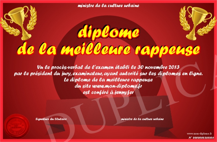 Envoyez par email votre diplôme de la meilleure rappeuse personalisé