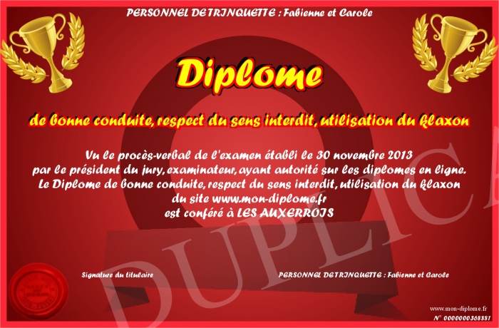 Envoyez par email votre Diplome de bonne conduite, respect du sens interdit, utilisation du klaxon personalisé