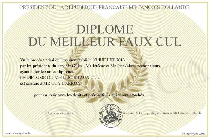 Envoyez par email votre DIPLOME DU MEILLEUR FAUX CUL personalisé