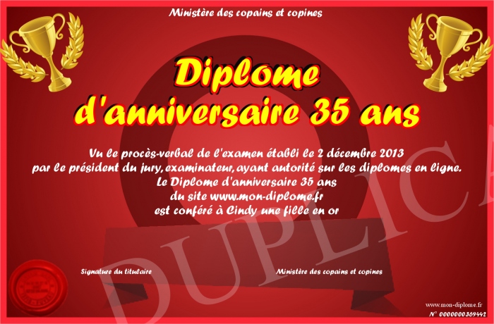 Envoyez par email votre Diplôme d'anniversaire 35 ans personalisé