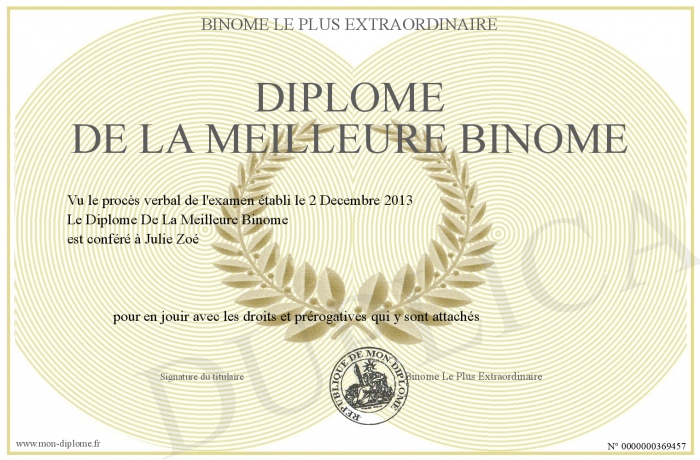 Envoyez par email votre Diplôme de la meilleure binome personalisé