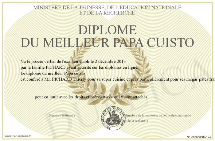 Envoyez par email votre Diplôme du meilleur Papa cuisto personalisé