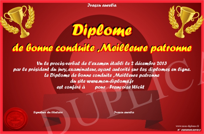 Envoyez par email votre Diplome de bonne conduite ,Meilleure patronne personalisé