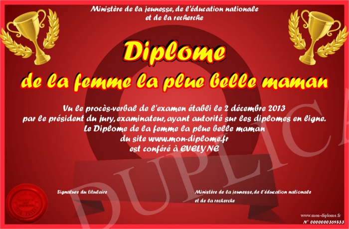 Envoyez par email votre Diplôme de la femme la plue belle maman personalisé