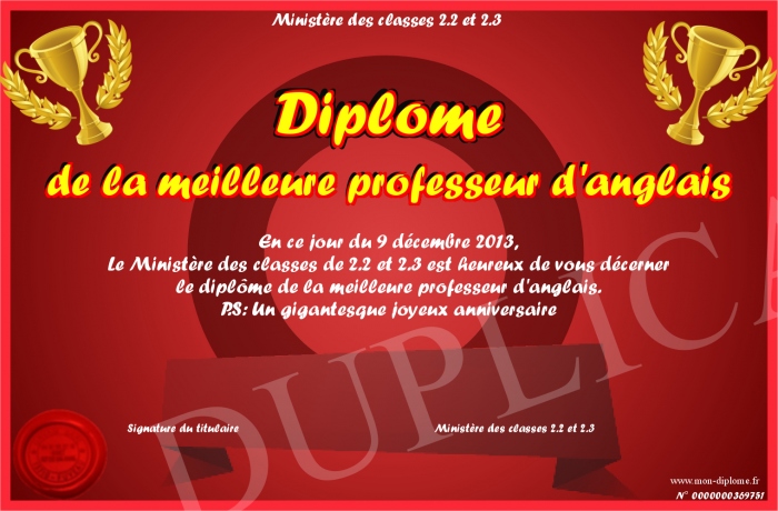 Envoyez par email votre Diplome de la meilleure professeur d'anglais personalisé