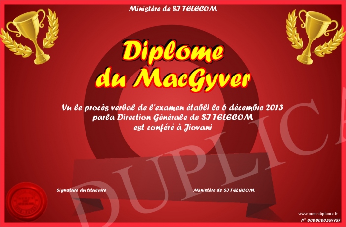 Envoyez par email votre Diplôme du MacGyver personalisé