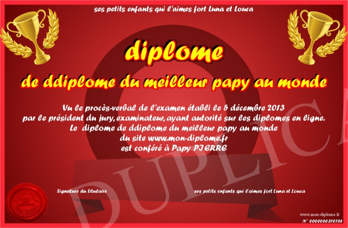 Envoyez par email votre diplome de ddiplome du meilleur papy au monde personalisé