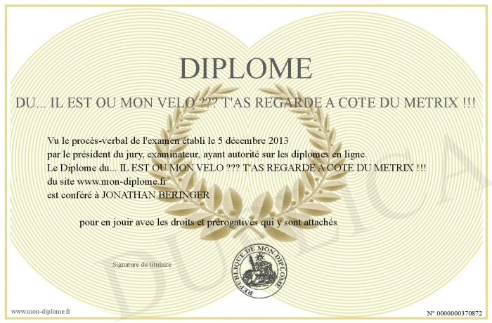 Envoyez par email votre Diplôme du... IL EST OU MON VELO ??? T'AS REGARDE A COTE DU METRIX !!! personalisé