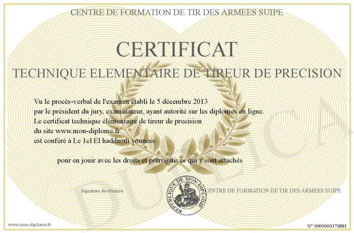 Envoyez par email votre certificat technique élémentaire de tireur de precision personalisé