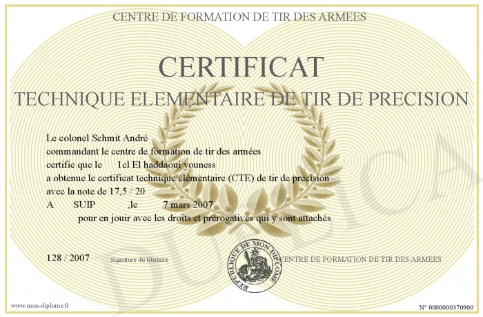 Envoyez par email votre certificat technique élémentaire de tir de precision personalisé