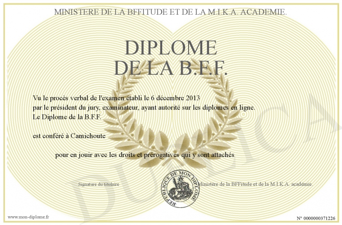 Envoyez par email votre Diplome de la B.F.F. personalisé