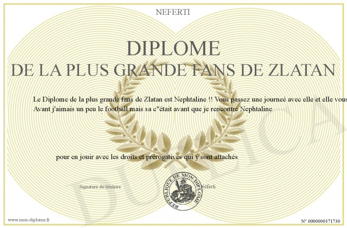 Envoyez par email votre Diplôme de la plus grande fans de Zlatan personalisé