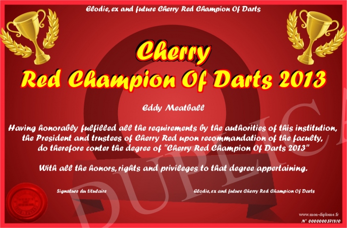 Envoyez par email votre Cherry Red Champion Of Darts 2013 personalisé