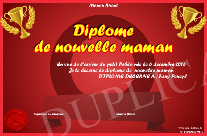 Envoyez par email votre Diplôme de nouvelle maman personalisé