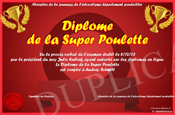 Envoyez par email votre Diplôme de la Super Poulette personalisé