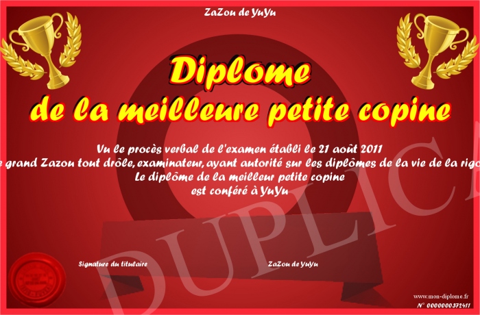 Envoyez par email votre Diplôme de la meilleure petite copine personalisé