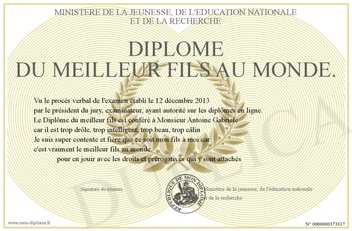 Envoyez par email votre Diplôme du meilleur fils au monde. personalisé