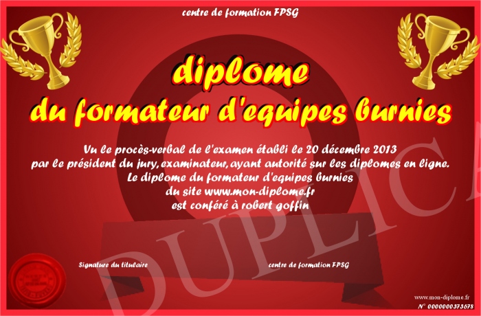 Envoyez par email votre diplome du formateur d'equipes burnies personalisé
