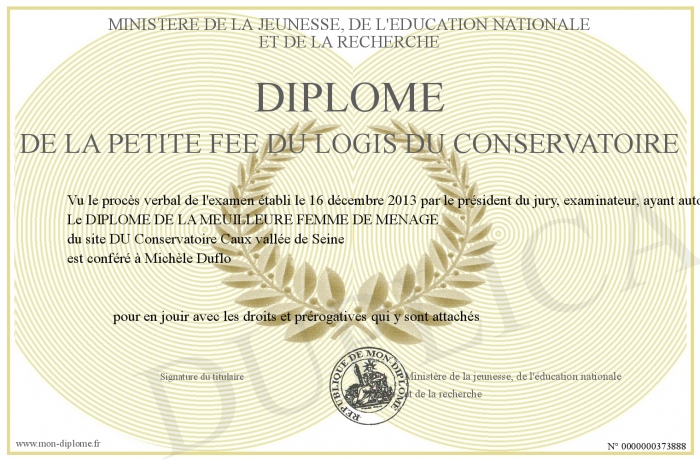 Envoyez par email votre Diplôme de la petite fée du logis du Conservatoire personalisé