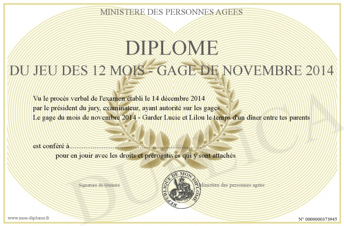 Envoyez par email votre Diplôme DU JEU DES 12 MOIS - GAGE DE NOVEMBRE 2014 personalisé