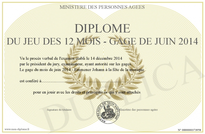 Envoyez par email votre Diplôme DU JEU DES 12 MOIS - GAGE DE JUIN 2014 personalisé