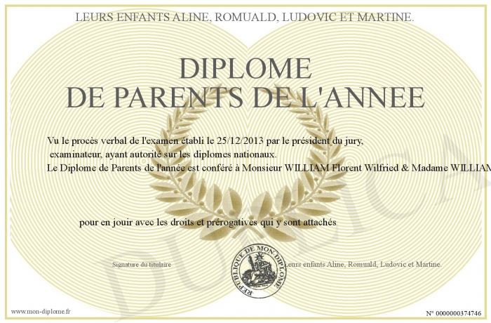 Envoyez par email votre Diplôme de Parents de l'année personalisé