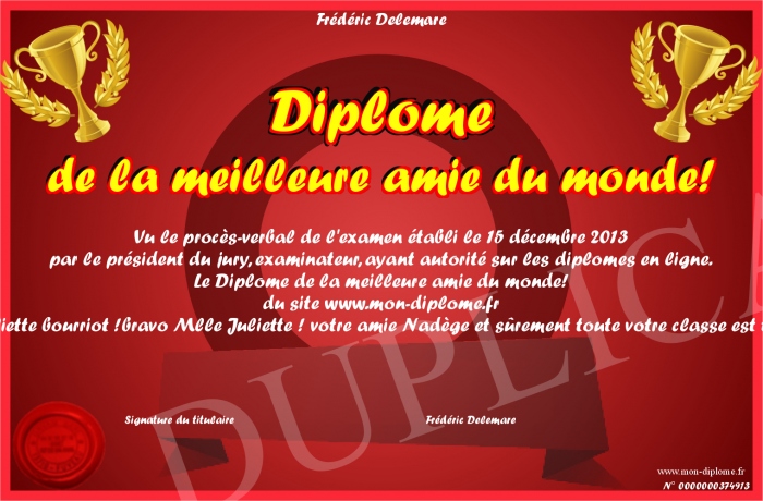 Envoyez par email votre Diplôme de la meilleure amie du monde! personalisé