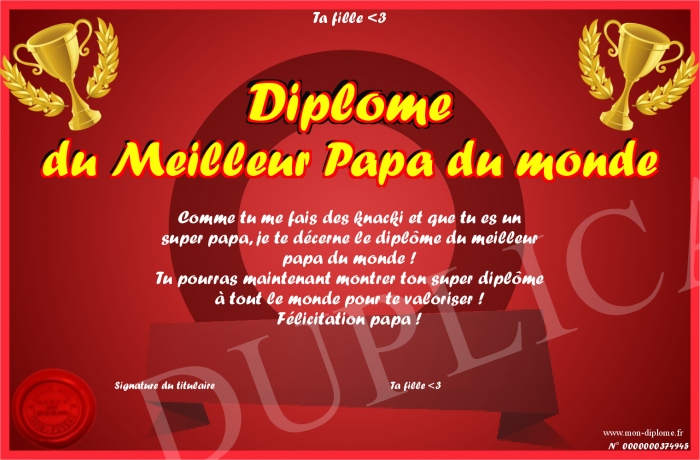 Envoyez par email votre Diplôme du Meilleur Papa du monde personalisé