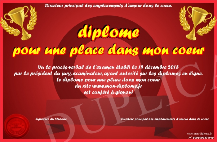 Envoyez par email votre diplôme pour une place dans mon coeur personalisé