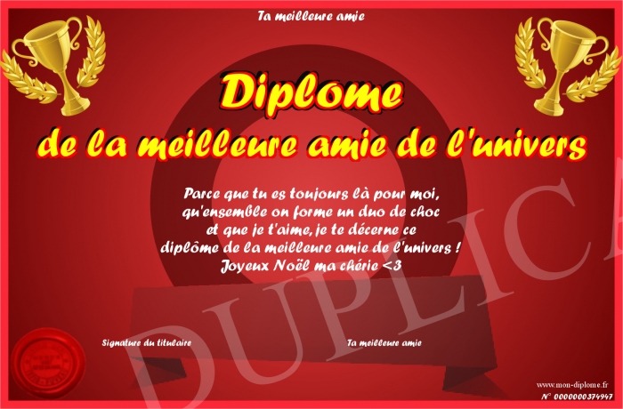Envoyez par email votre Diplôme de la meilleure amie de l'univers personalisé