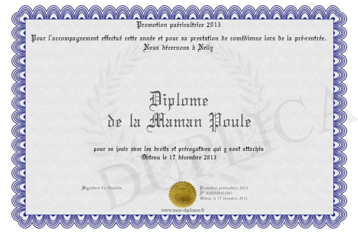 Envoyez par email votre Diplôme de la Maman Poule personalisé