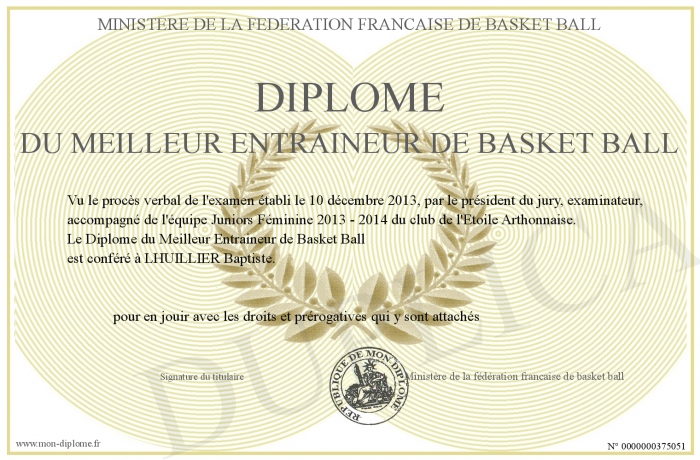 Envoyez par email votre Diplôme du Meilleur Entraineur de Basket Ball personalisé