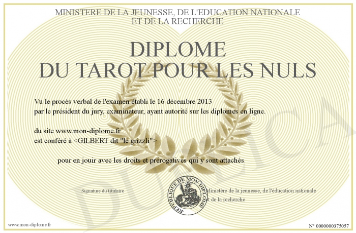 Envoyez par email votre DIPLOME DU TAROT POUR LES NULS personalisé