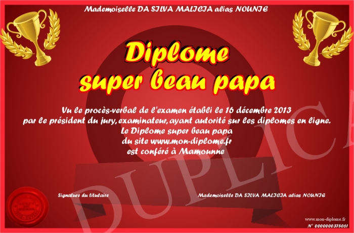Envoyez par email votre Diplôme super beau papa personalisé