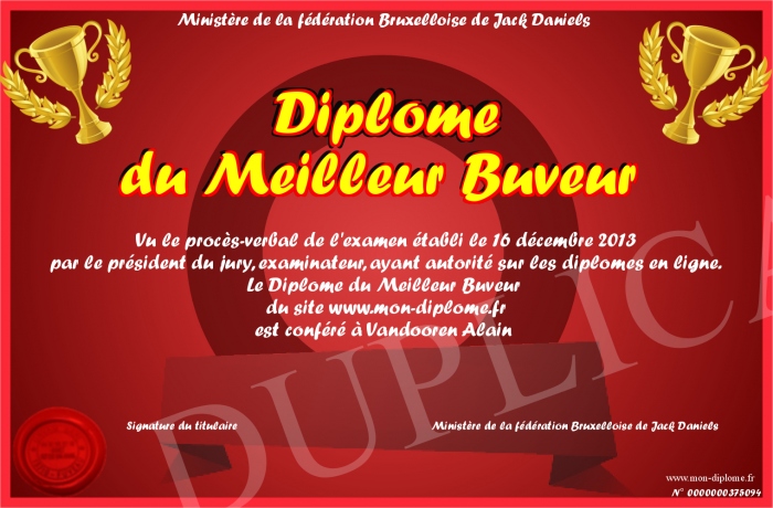 Envoyez par email votre Diplôme du Meilleur Buveur personalisé