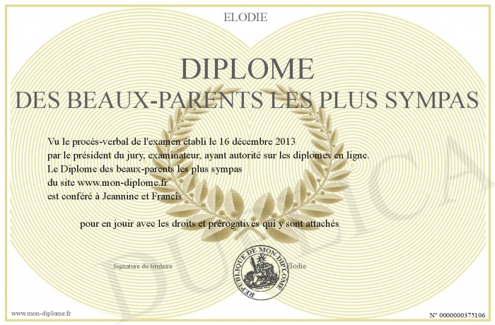 Envoyez par email votre Diplôme des beaux-parents les plus sympas personalisé