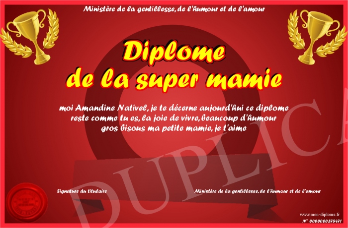 Envoyez par email votre Diplôme de la super mamie personalisé
