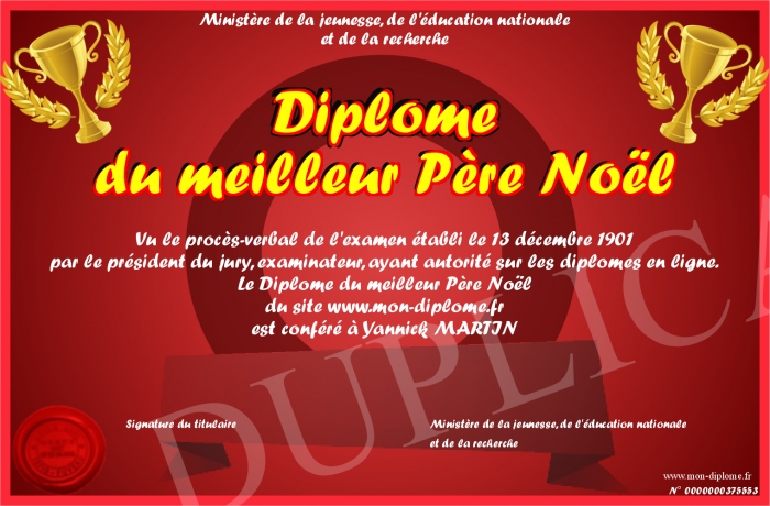 Envoyez par email votre Diplôme du meilleur Père Noël personalisé