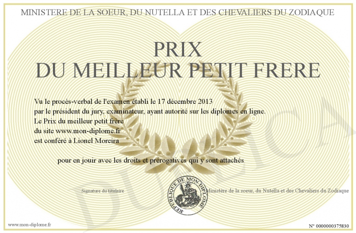 Envoyez par email votre Prix du meilleur petit frère personalisé