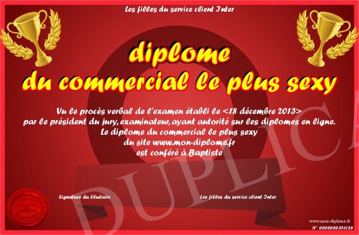 Envoyez par email votre diplome du commercial le plus sexy personalisé