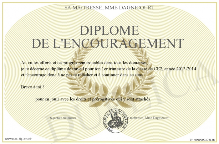 Envoyez par email votre Diplôme de l'encouragement personalisé