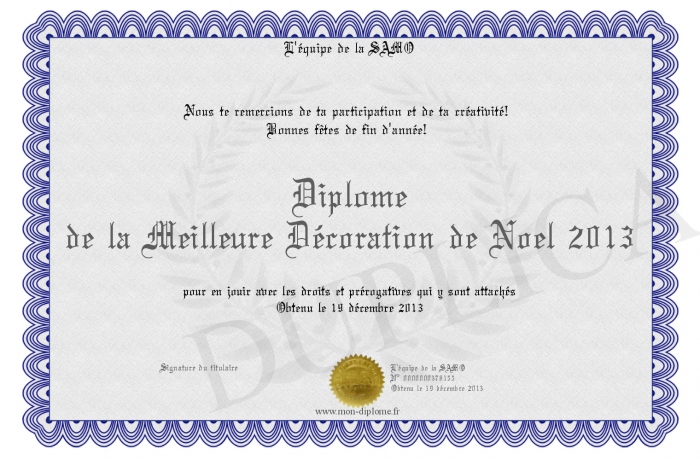 Envoyez par email votre Diplôme de la Meilleure Décoration de Noel 2013 personalisé