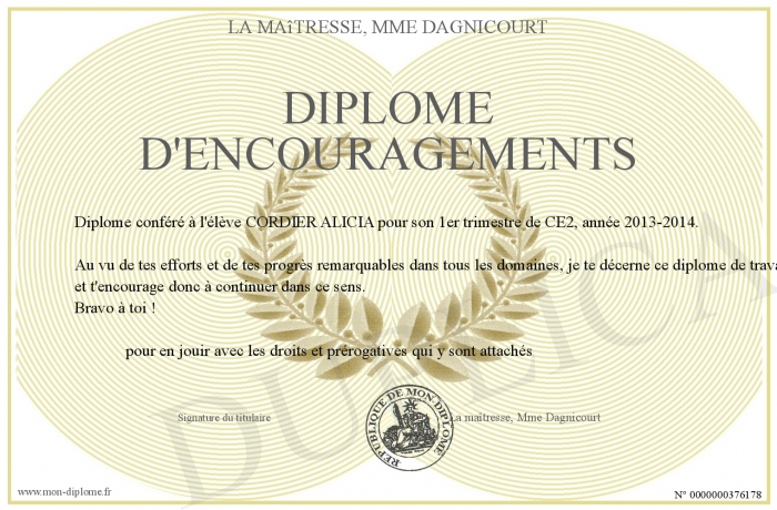 Envoyez par email votre Diplôme d'encouragements personalisé