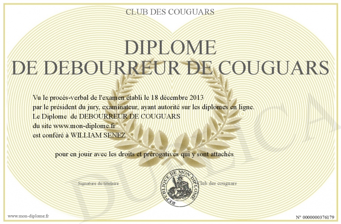 Envoyez par email votre Diplôme de DEBOURREUR DE COUGUARS personalisé