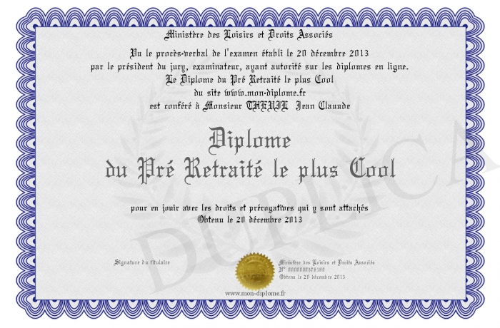 Envoyez par email votre Diplôme du Pré Retraité le plus Cool personalisé