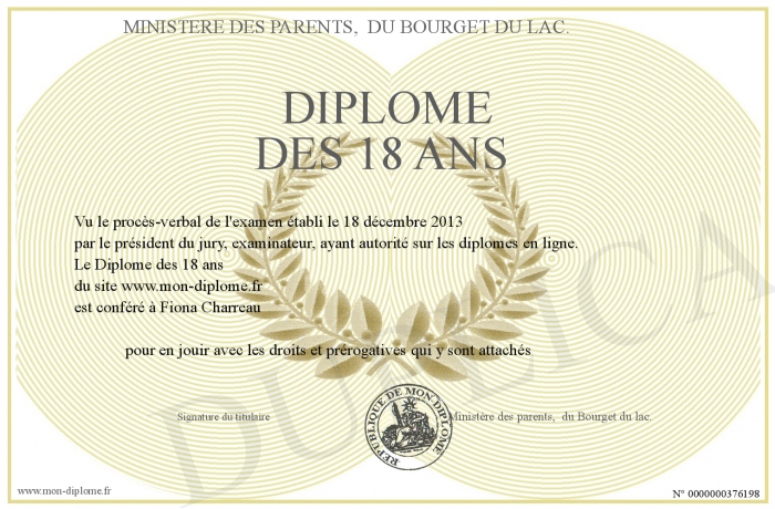 Envoyez par email votre Diplôme des 18 ans personalisé