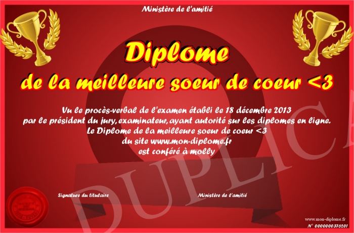 Envoyez par email votre Diplôme de la meilleure soeur de coeur -3 personalisé