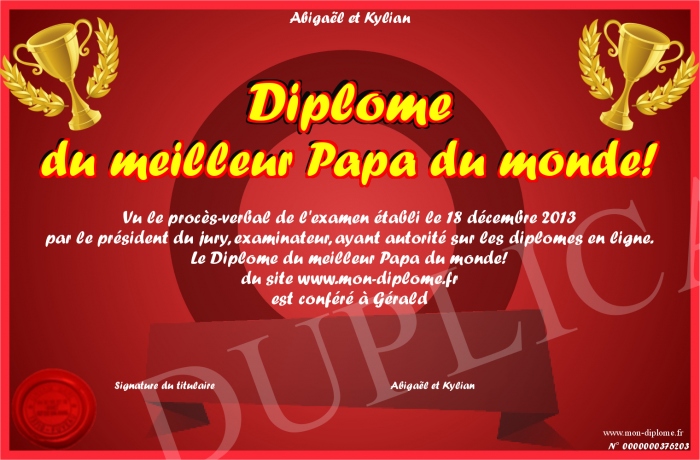 Envoyez par email votre Diplôme du meilleur Papa du monde! personalisé