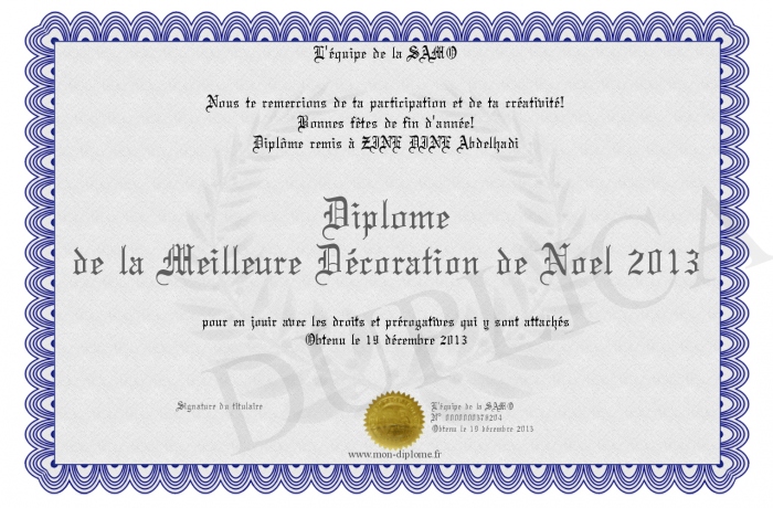 Envoyez par email votre Diplôme de la Meilleure Décoration de Noel 2013 personalisé
